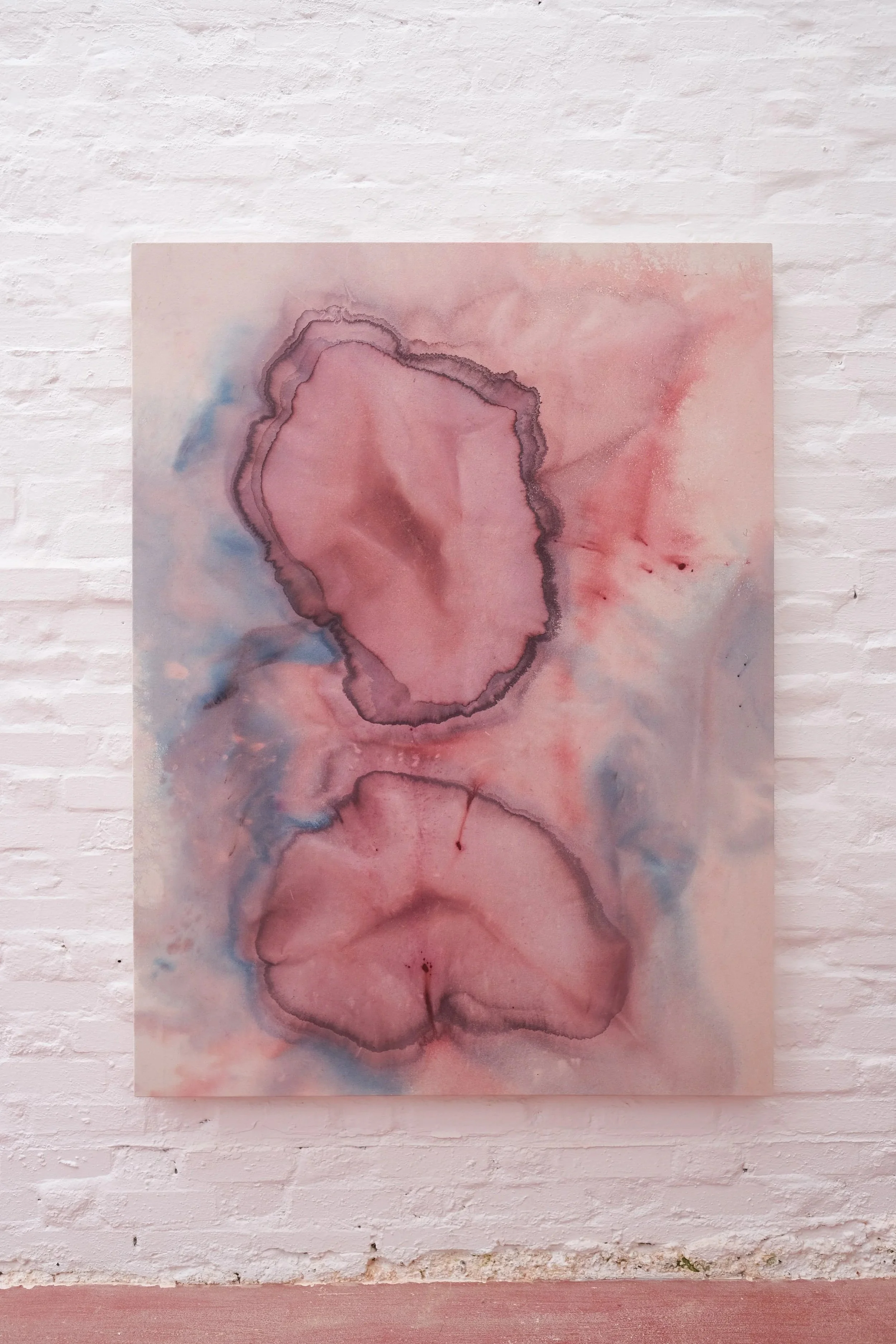 Painted in the Swedish forest near the Baltic Sea. ‘Daughter cell’ is a reflection that we are all born with a soft, agile and open demeanour. The edges of the moon jellyfish is painted with plastic as a represenatation of how through living the edges become harder and stiffer. I look at my children and remind myself ‘to keep their jelly as soft as possible for as long as possible’.