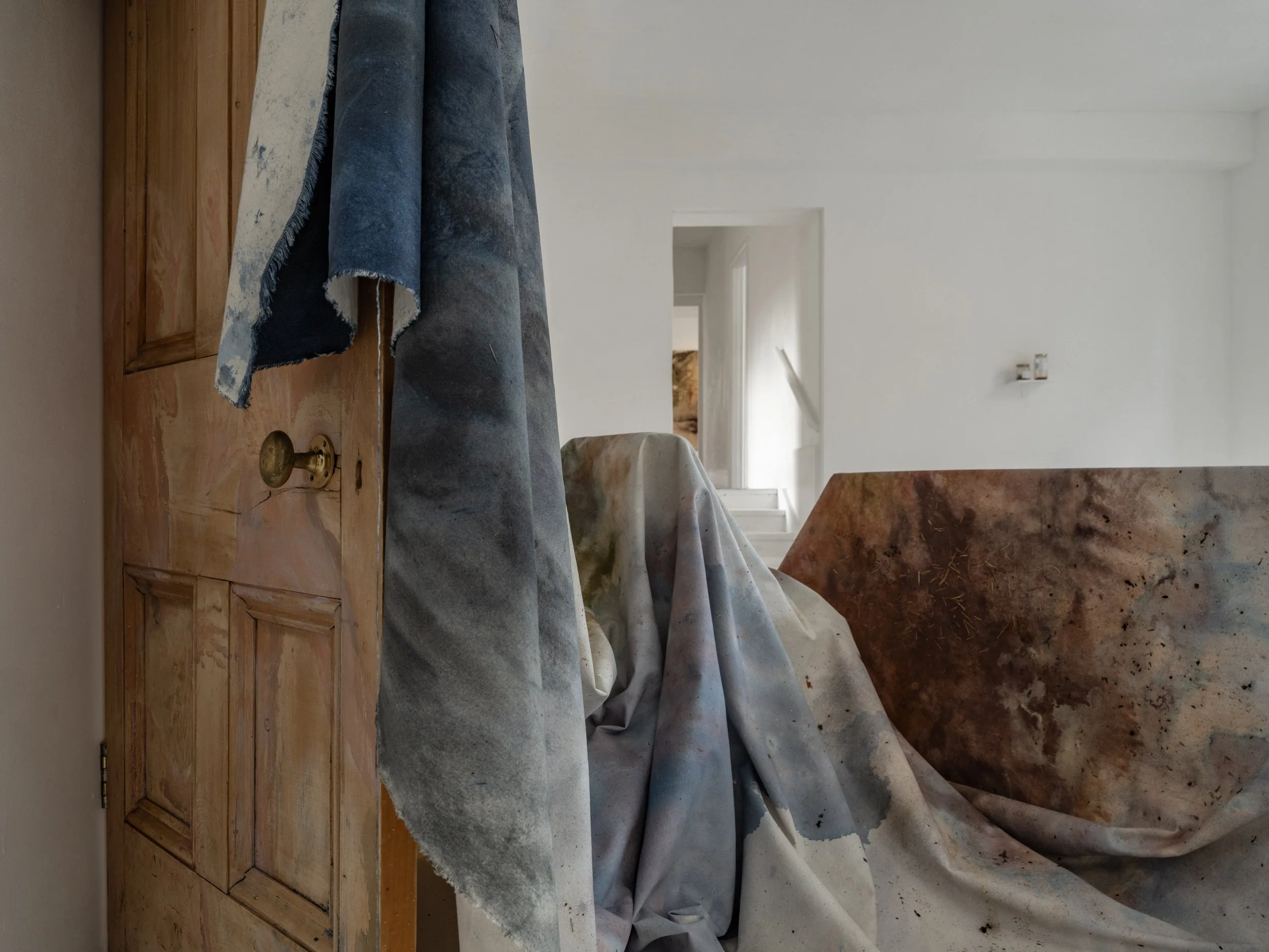 The raw canvas was plunged in the Thames and worked on by the shore of the river. It is dirty and filled with debris of us. I struggle to see beyond the water surfaces. She sits on secrets and unknown. She silently listens to us and living with us. A contemplation of time. Water tides has an undeniable effect (affect) on us. Its literal effect of gravity, magnetic pull and cycles but also the metaphorical tides forming us as humans. Further the quote of ‘Time and tide wait for no-man’ sprung to my mind. The idea of water eroding the surroundings, creating patina of age, reforming and replenishing. It portrays eternity, infinity and passing of time. Maybe in an almost spiritual way the water shows us: we are equal and we will all die.